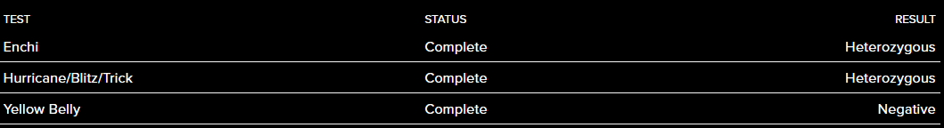 This little girl was produced from my Kinova OD YB Enchi Hurricane Pied 50% het MJ Axanthic with a Pied Female. There is OD in the pairing but not sure if she has it – confirmed by shed test to be positive for Hurricane and Enchi and negative for Yellow Belly.